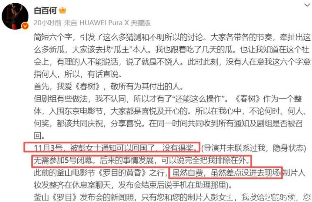 并且在11月6号的时候她再次在自己的社交平台账号上发了一条“作文”,而这条动态中她说了自己的那些“委屈事”。从她嘴里听到的是剧组通知她没有得奖,并且也不用参加之后的闭幕式,直接让她回国。