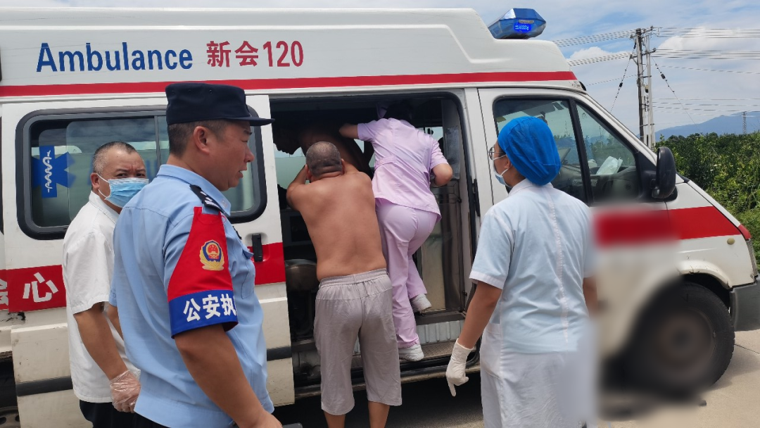 户外依然骄阳似火,热浪袭人,民警时刻关注着老人的状态,不久救护车赶到,警民协助医护人员将老人抬上救护车送医,老人经治疗已无大碍。